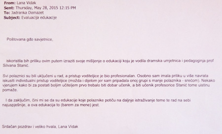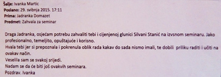 Sudjelovanje na više od 20 stručnih skupova kao autorica, predavačica i voditeljica radionica u radu na edukaciji i stručnom usavršavanju nastavnika, učitelja i stručnih suradnika u osnovnim i srednjim školama. - Županijski stručni skup za učitelje razredne nastave u osnovnim školama Županije splitsko-dalmatinske: "Govorna interpretacija umjetničkog teksta u nastavi", Split, travanj - svibanj 2015. godine (klikni za uvećanje):